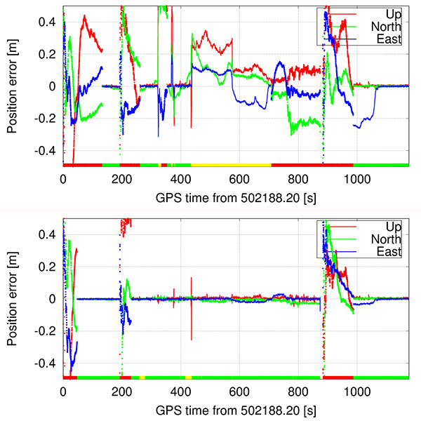 As a reference, a commercial GNSS/INS system using a tactical-grade IMU was used. The dual-frequency, multi-GNSS, carrier-phase post-processing of the reference data provided a reference position of better than 1 cm estimated standard deviation in all three axes, which is in the following referred to as “truth.”