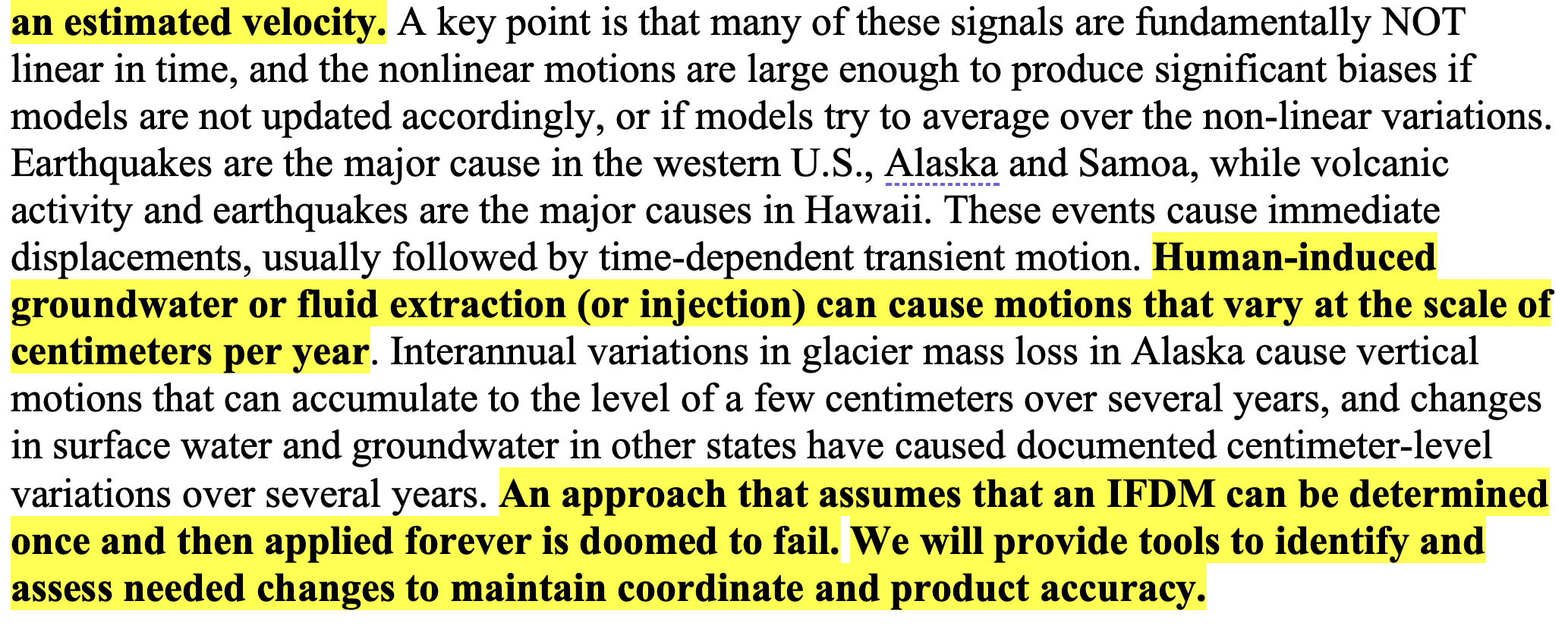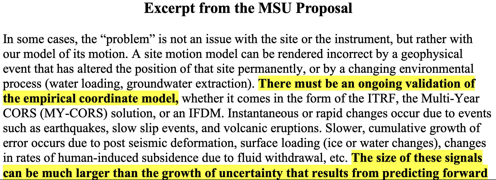 The new, modernized NSRS will offer time-dependent coordinates based on an IFDM. This has been described in previous GPS World newsletters (February 2022 and August 2022). The MSU proposal includes developing a model that accounts for crustal movements — such as earthquakes, slow slip events, and volcanic eruptions, — as well as slower, cumulative growth of error due to post-seismic deformation, surface loading (ice or water changes) and changes in rates of human-induced subsidence due to fluid withdrawal. Like any model, the IFDM model will have uncertainties. Being able to provide a realistic estimate of the uncertainties of the IFDM is very important. The PIs of the proposal have extensive knowledge and experience in generating models and uncertainties. As noted in their proposal, the “problem” may not be an issue with the site or the equipment but with the model. See the box titled “Excerpt from the MSU Proposal.” I have highlighted several sections that I believe are important to the users of the new, modernized NSRS.