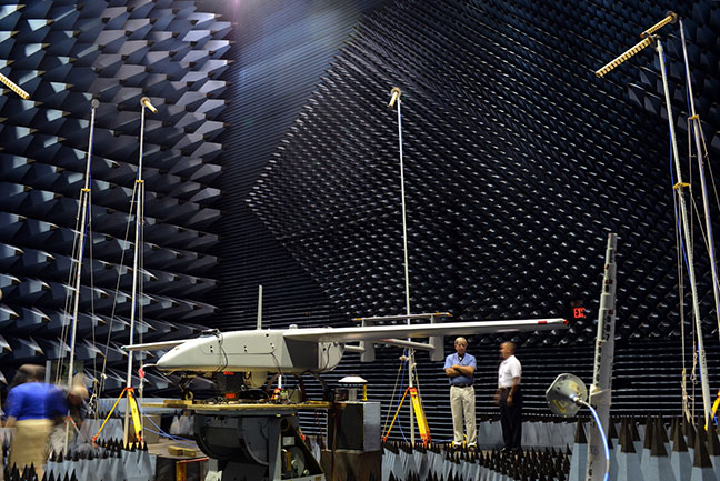 The Navy’s Communications and GPS Navigation Program Office (PMW/A 170) mounted a Small Antenna System on an Aerostar unmanned aircraft then placed it in a room lined with signal-absorbent material, where it was subjected to GPS jamming signals at Naval Air Station Patuxent River, Md. Part of an initiative to protect GPS technologies on small unmanned aerial vehicles, the Navy conducted the tests in July to demonstrate how miniaturized GPS protection devices can prevent interruption of the mission-critical global positioning data. (U.S. Navy photo)