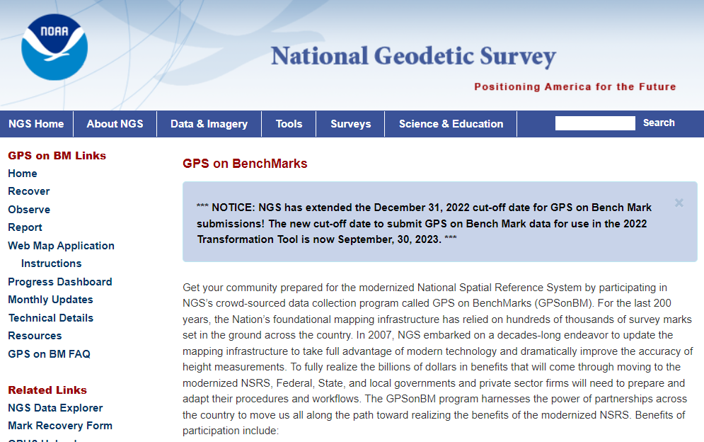 I’ve been highlighting NGS’s GPS on Bench Mark program that supports the 2022 Transformation Tool in my columns since 2018. NGS delayed the completion date for the new modernized NSRS until 2025, so they have extended the cut-off date for submitting GPS on Bench Mark data for use in the 2022 Transformation Tool until Sept. 30.