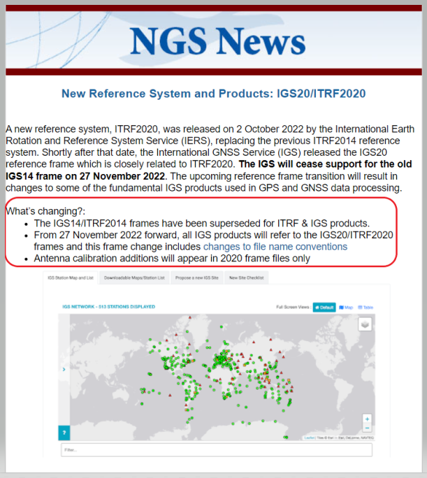 I’d like to note that OPUS has been updated to support the newly released ITRF2020 (IGS20) orbits. My October 2022column discussed the latest International Terrestrial Reference Frame of 2020 (ITRF2020) released by the International Earth Rotation and Reference System Service (IERS). A previous NGS news bulletin provided a statement about the new reference system and products.