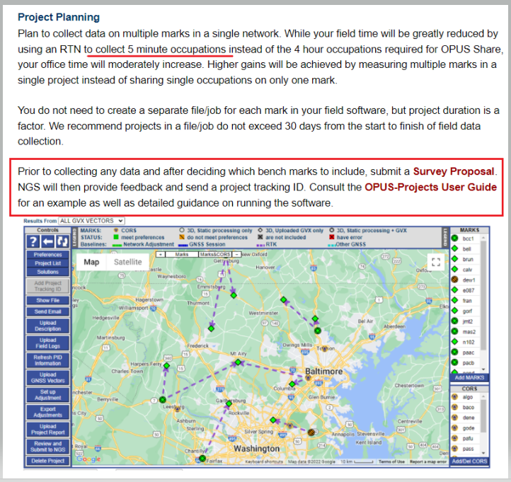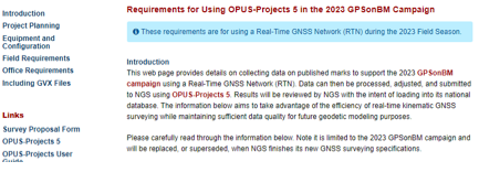 Clicking on the link titled “NEW: 2023 Requirements for Use in the GPSonBM Campaign” on the OPUS Projects 5.1 webpage provides the requirements for using OPUS Projects 5.1 and Real-Time Network (RTN) data to support the 2022 Transformation Tool; that is the 2023 GPS on BM campaign. There are five sections in the writeup: Introduction, Project Planning, Equipment and Configuration, Field Requirements and Office Requirements. The Introduction section states that the requirements are limited to the GPS on BM Campaign and will be replaced, or superseded, when NGS finishes its new GNSS surveying specifications.