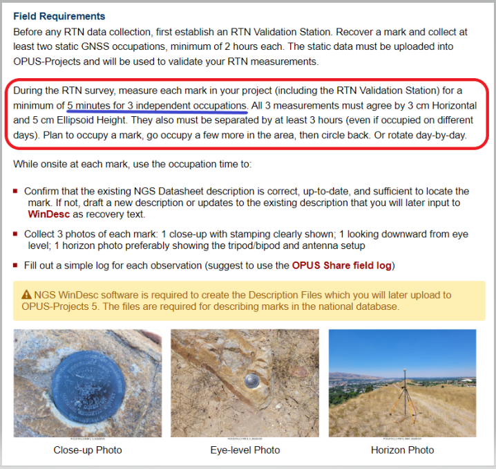 “During the RTN survey, measure each mark in your project (including the RTN Validation Station) for a minimum of 5 minutes for three independent occupations. All three measurements must agree by 3 cm horizontal and 5 cm ellipsoid height. They also must be separated by at least 3 hours (even if occupied on different days). Plan to occupy a mark, go occupy a few more in the area, then circle back. Or rotate day-by-day,” the section states.