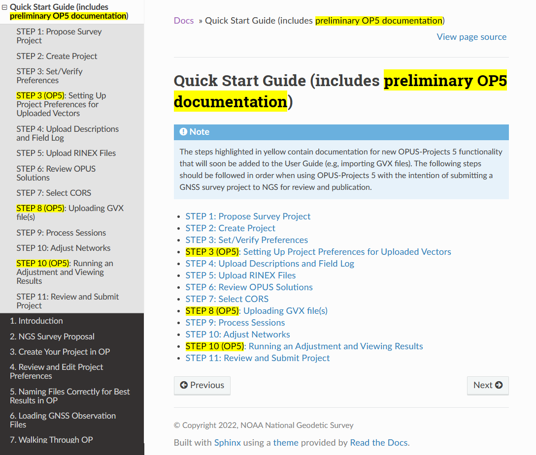 As stated in the section on office requirements for using OPUS-Projects 5 in the 2023 GPS on BM Campaign writeup,“The OPUS-Projects User Guide provides instructions on how to run the software and submit a project to NGS. The User Guide states to follow the steps in the order listed below, and it explains steps 1 – 7 and 9 – 11 in detail. For step 8 and when including GVX data in OPUS-Projects 5, refer to those portions of the User Guide’s Quick Start which are highlighted in yellow. NGS is working on fully updating the User Guide to include more details; for now, use the Quick Start Guide for assistance with GVX.”