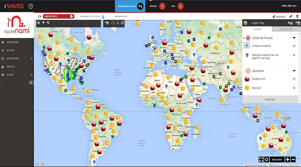 RippleNami, a cloud-based visualization platform, allows users such as Santa to access data from countless sources and customize information layers into an easy-to-use map. Below is a snapshot of the data Santa can integrate into the RippleNami platform to efficiently and safely deliver presents this year.