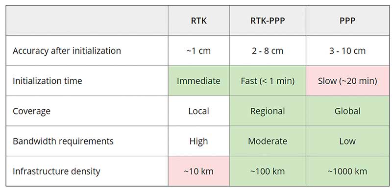 Each of these methods has advantages and disadvantages (see table 1). RTK, which relies on communication between the user and the local correction service, provides centimeter accuracy over small areas. PPP-RTK and PPP broadcast corrections and require a lighter infrastructure, making them scalable for mass-market and industrial applications. The new services are cheaper and more user-friendly than traditional correction services.