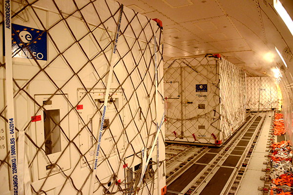 Named “Doresa” and “Milena,” the two Galileo FOC satellites arrived at the Félix Éboué international airport in French Guiana at 02:00 local time. They spent the day in an airlock to acclimatize before being taken to their new home, the S1A clean room, where they could be safely unpacked to begin the launch campaign.
