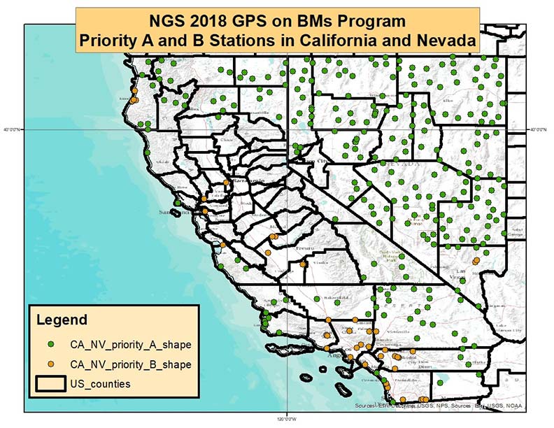 Figure 5 – NGS 2018 GPS on BMs Program – Priority A and B Stations in California and Nevada.