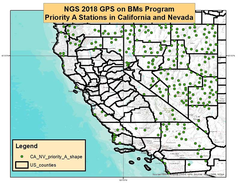 Figure 6 – NGS 2018 GPS on BMs Program – Priority A Stations in California and Nevada.