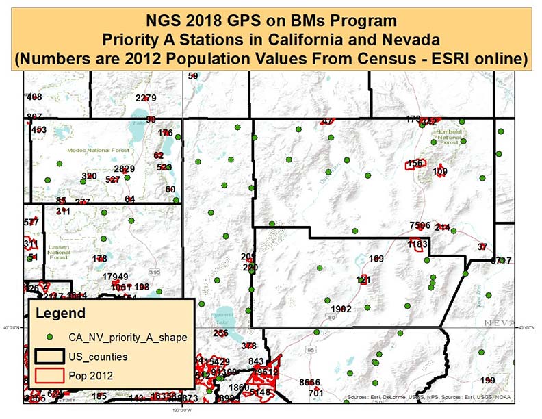 Figure 7 – NGS 2018 GPS on BMs Program – Priority A Stations in California and Nevada. (Numbers are 2012 Population Values from Census – ESRI online)