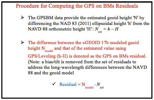 NGS’ process for determining which stations were outliers and which stations should be re-observed involved analyzing both GNSS and leveling data from NGS’ database. The GPS on BMs residuals were computed using the procedure described in the box titled “Procedure for Computing the GPS on BMs Residuals.”