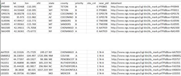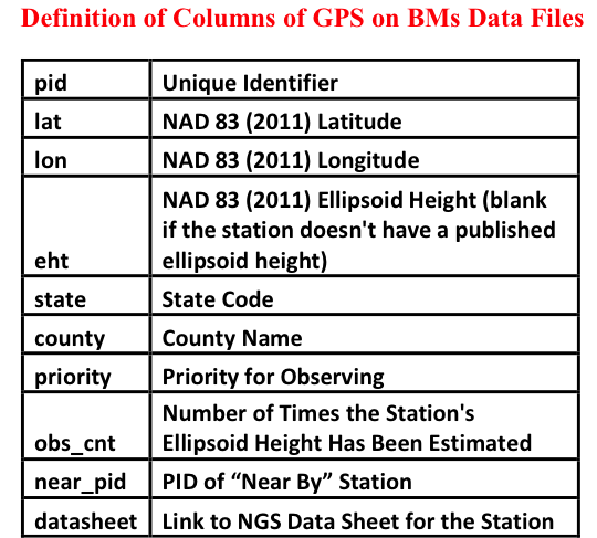 As previously mentioned, the list of stations that NGS would like observed with GNSS are provided in three formats: excel spreadsheet, esri shapefile, and Google Earth kmz. The box titled “Sample Data Elements Extracted from the Excel File Titled “gpsonbm_priority_list_20180205.xlsx” provides a sample of the data from the excel file. The box titled “Definition of Columns of GPS on BMs data file” provide the columns and a brief definition of the data field.