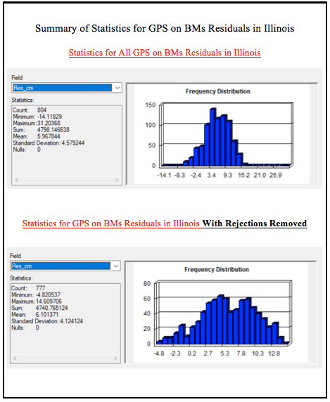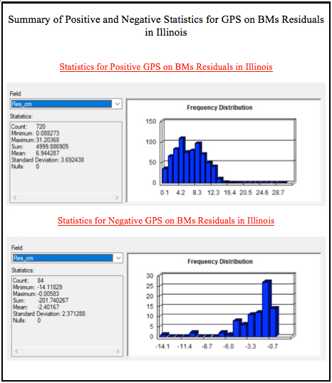Figure 8 depicts the location of the GPS on BMs stations in Illinois. The box titled “Summary of Statistics for GPS on BMs Residuals in Illinois” provides a summary of the GPS on BMs residuals for the State of Illinois. The results indicate that there are 804 GPS on BMs in Illinois and the residuals range between -14.1 cm to 31.2 cm. They have a mean of 6.0 cm with a standard deviation of 4.6 cm. The table titled “Statistics for GPS on BMs Residuals in Illinois With Rejections Removed” indicates that most residuals fall between 2 and 10 cm. The box titled “Summary of Positive and Negative Statistics for GPS on BMs Residuals in Illinois” provides a summary of the statistics for the positive and negative set of residuals.