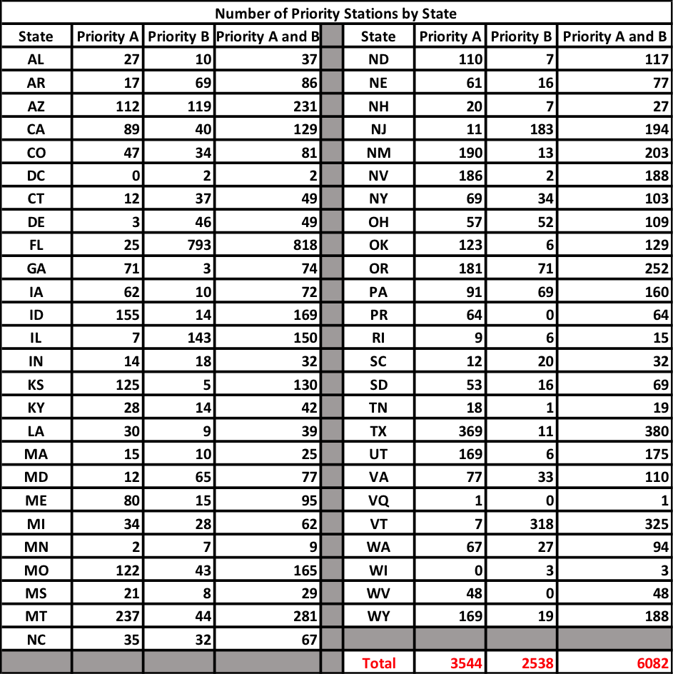 The box titled “Number of Priority Stations in Each State” provides the number of priority A and B stations for every State in the lower 48, the District of Columbia, Puerto Rico, and the Virgin Islands. Overall, there are 6082 stations in the list – 3544 Priority A stations and 2538 Priority B stations.