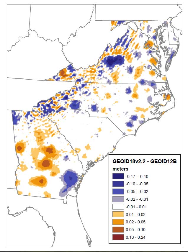 Figure 1 is a plot of the change between the prototype GEOID18v2.2 and GEOID12B in the Mid-Atlantic States. Looking at figure 1, the reader can see that there are some significant differences between the prototype hybrid geoid model values and the published GEOID12B values. On figure 1, all of the dark blue values are differences at the -10 cm level and the dark orange values are differences at the 10 cm level. There are several reasons for these changes including newly observed gravity data observations (especially in area with new GRAV-D data), improved data and models from satellites programs, new and improved algorithms for processing gravity data and estimating topographic effects, additional OPUS Share results in areas where GEOID12B didn’t have observations, and differences based on stations that were included in GEOID12B but rejected in the prototype model based on the latest detailed analysis.