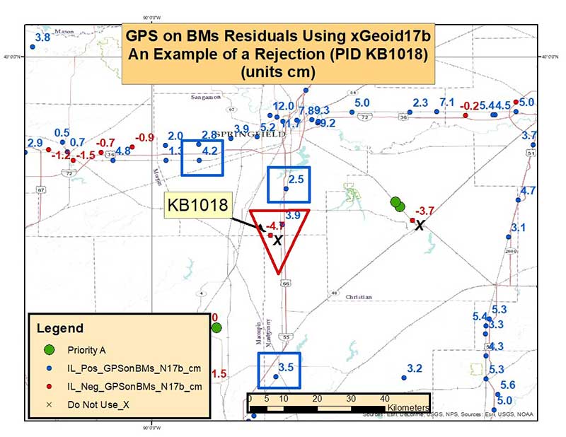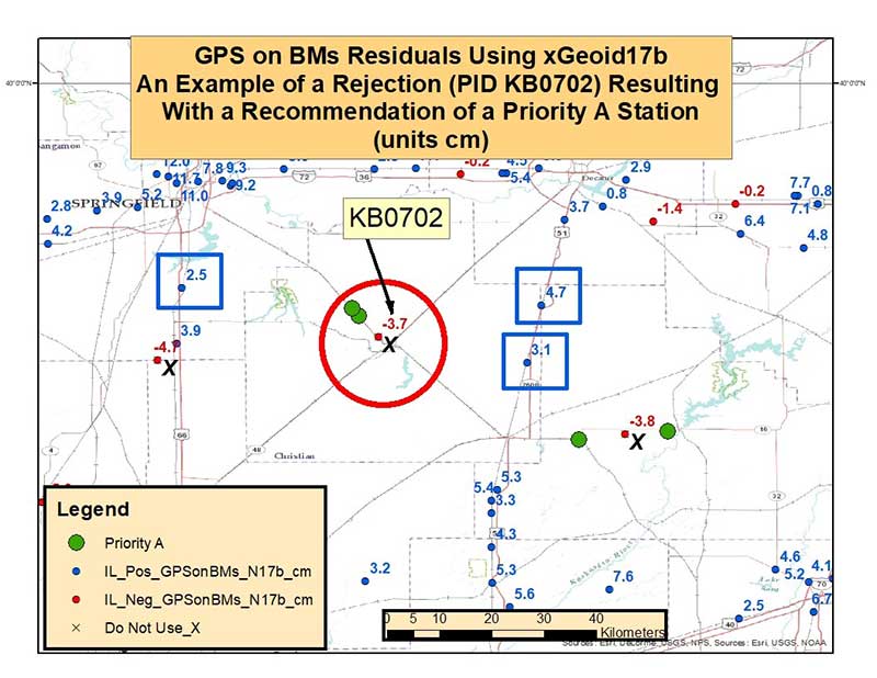 Figure 9 depicts the GPS on BMs residuals in the Springfield, Illinois, Region. During the detailed analysis of the latest GPS on BMs dataset, the analysts identified outliers that appeared to be large relative to their neighbors. Figure 9 depicts these outliers with a “X.” Stations designated with a “X” are stations that were designated as DO NOT USE in the creation of the hybrid geoid model. Figure 9 also indicates were the analyst recommended that a station should be observed before the creation of the next hybrid geoid model. These stations are labeled as Priority A stations on figure 9. Figure 10 is an enlargement of the same area that depicts a station that was recommended to be rejected in the hybrid geoid model (PID KB0702). The stations surrounding PID KB0702 all seem to be consistent with each other (residuals in smaller blue squares) so the analyst recommended that station KB0702 be rejected. At the same time, by rejecting this station, this creates a void area that needs to be filled. Therefore, the analyst also recommended that a new station be observed here; hence, the two priority A station plotted near the rejected station. Figure 11 is a plot of another rejected station (KB1018) in the same region but, in this case, the analyst did not recommend an additional observation in the area because there was another nearby station (station in red triangle) that was consistent with its neighbors (residuals in smaller blue squares).