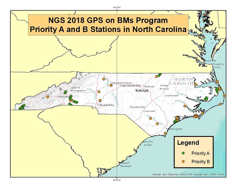 Figure 2 – NGS 2018 GPS on BMs Program – Priority A and B Stations in North Carolina.