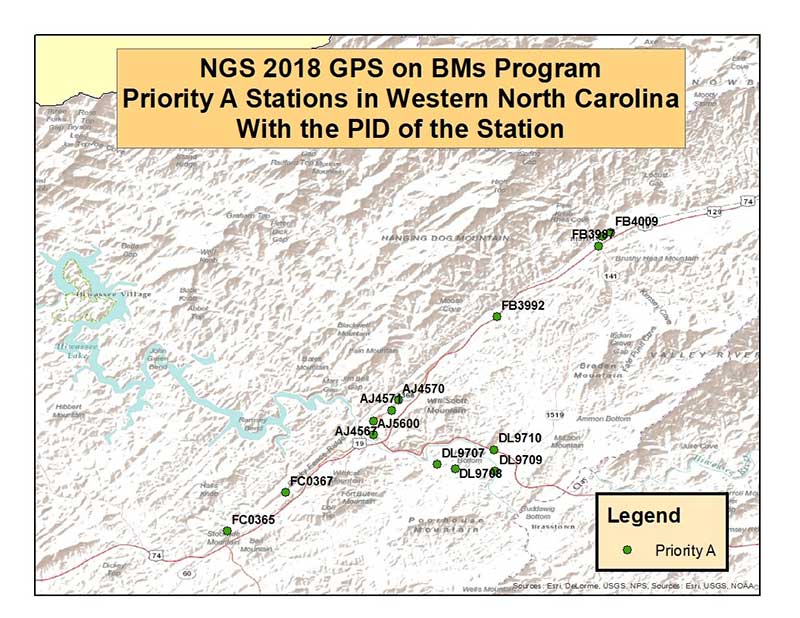 Figure 3 – NGS 2018 GPS on BMs Program – Priority A Stations in Western North Carolina With the PID of the Station.