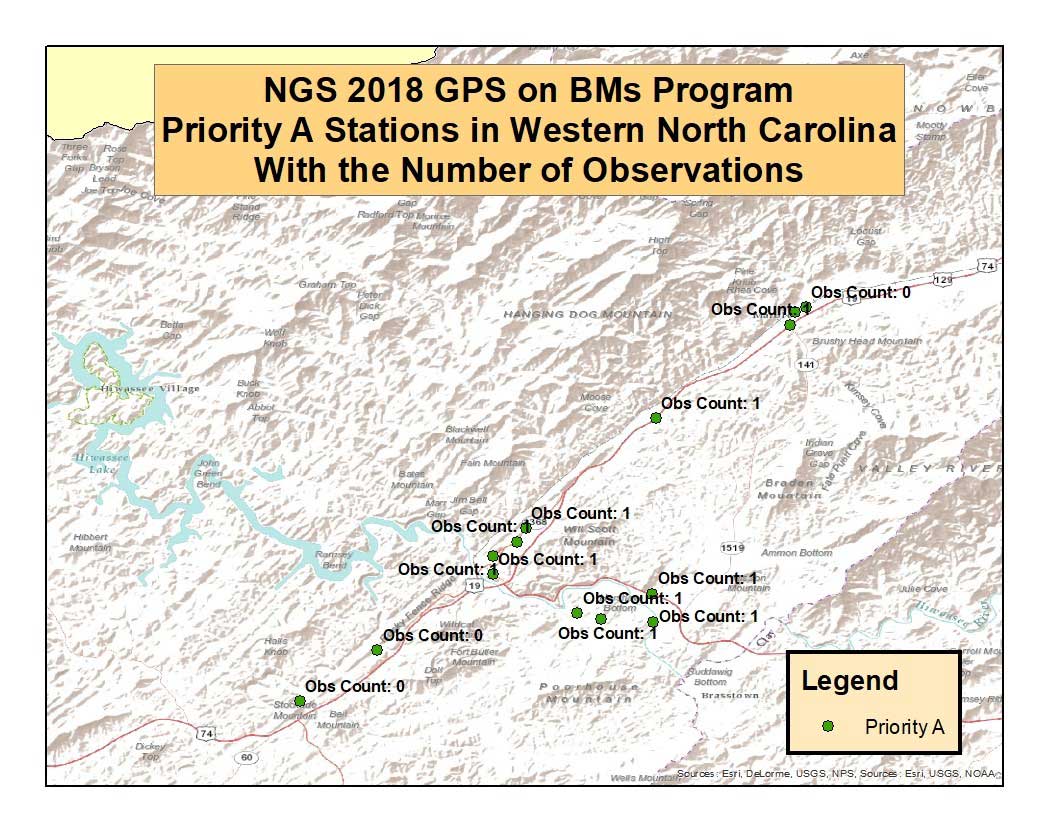 Figure 4 – NGS 2018 GPS on BMs Program – Priority A Stations in Western North Carolina With the Number of Observations.