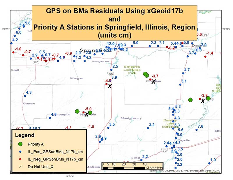 Figure 9 – GPS on BMs Residuals Using xGeoid17b and Priority A Stations in Springfield, Illinois, Region (unit cm).