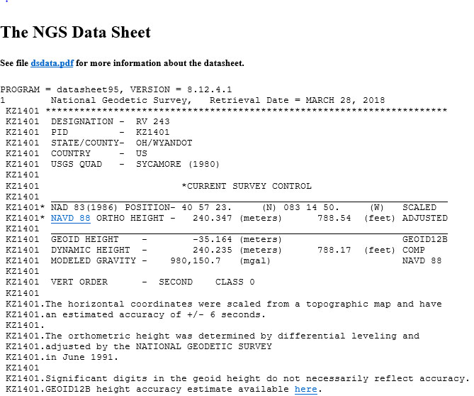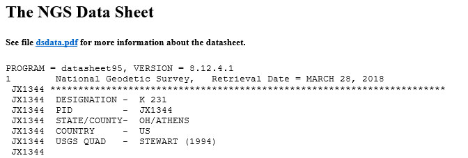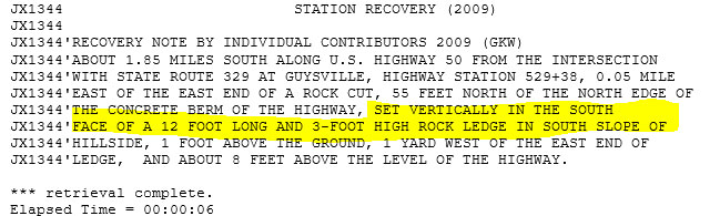 The last category of stations that are shown on the web map are monuments that are reported as unfounded or not GPSable. This is very useful information for NGS and others to have on datasheets. The box titled ” Output from Search Feature for PID JX1344 “ depicts bench mark PID JX1344 that is labeled as unfound or not GPSable. The datasheet for JX1344 indicates that the bench mark is set vertically in a rock ledge (see highlighted section in the box titled “Excerpt from the Datasheet for PID JX1344.”