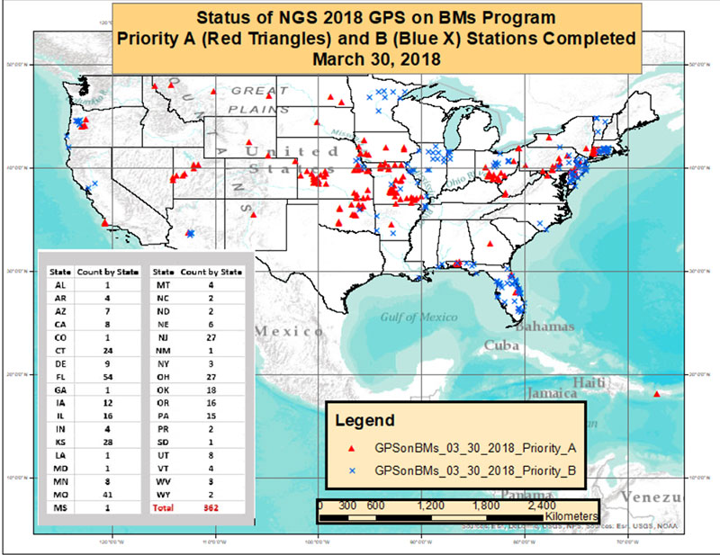 As of March 30, 362 of the 5745 priority marks have been completed. The box titled “Status of NGS 2018 GPS on BMs Program as of March 30, 2018“ is a plot of the stations that are completed, and the box titled “Count of Stations Completed by State “ provides the number of stations completed by state. The red triangles are priority A stations completed and the blue “X” are priority B stations labeled as completed.