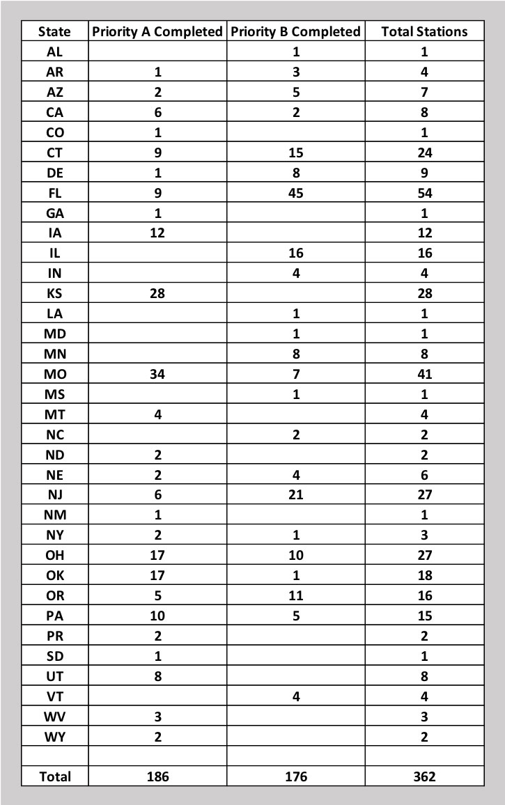 It appears that the central portion of the country has been very active. For example, there are 34 priority A stations completed in Missouri and 28 completed in Kansas. The State of Florida has completed 45 priority B and nine priority A stations for a total of 54 stations (see box titled “Count of Stations Completed by State “).