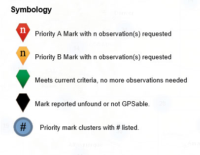 The user can continue to check on the map until the map depicts individual bench marks where the symbology indicates the status of the monuments. The symbology labels are fairly straightforward. The box titled “The Web Map Symbology” provides the five different categories of monuments.