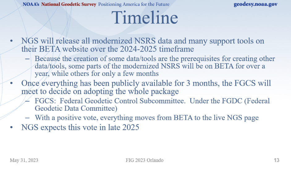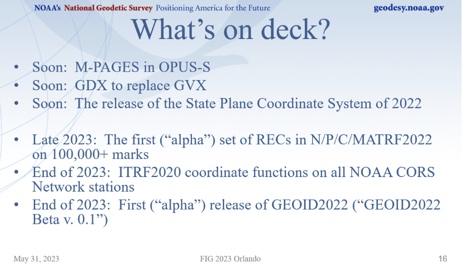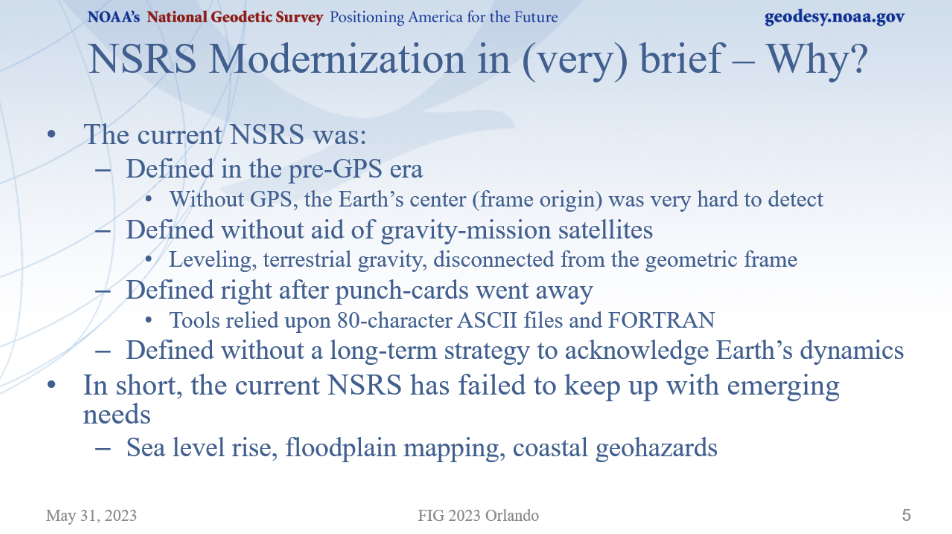 Anyone reading my previous columns knows that I have been highlighting the new, modernized, National Spatial Reference System (NSRS) of the National Geodetic Survey (NGS). During the 2023 Fédération Internationale des Géomètres (FIG) Working Week held on May 28 – June 30, in Orlando, Florida, NGS held an all-day session addressing various topics related to the NSRS modernization project.