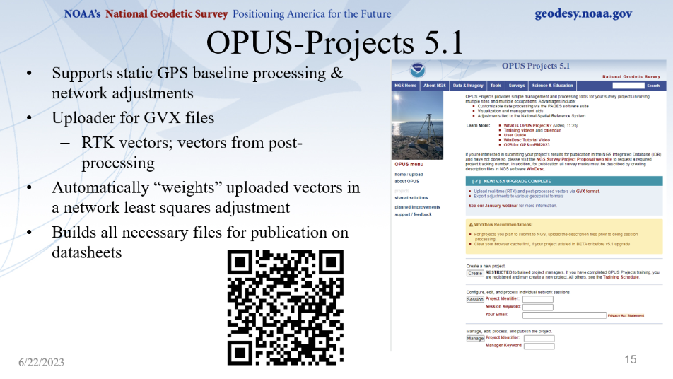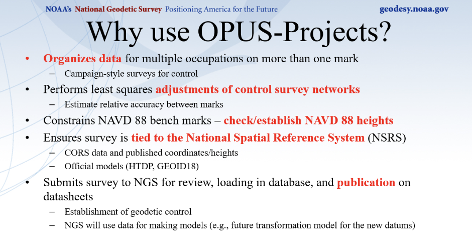 Another presentation titled “OPUS-Projects for Manager’s Training – Transitioning from Instructor-Led to Online, Self-Paced Instruction” by Erika Little, described how NGS is transitioning to providing OPUS projects training on an online, self-paced instruction site. NGS has training material available for OPUS-Projects.