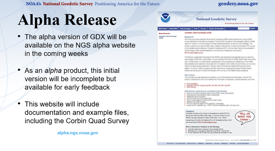 Smith discussed how some products will be released early for users to test and evaluate how the new NSRS products will affect their products and services, and to be ready for their customers after the new NSRS is released for publication. Products scheduled for early releases (Alpha Release), include SPCS2022, EPP2022, and GEOID2022.