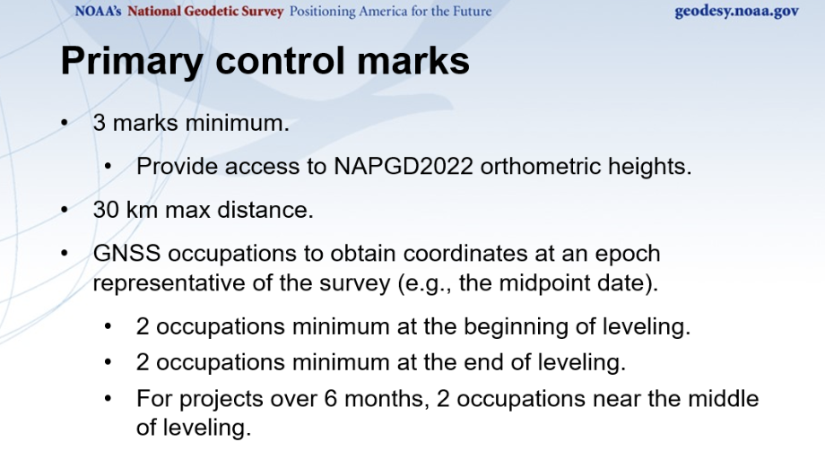 One major change is that leveling surveys will require GNSS occupations to ensure that orthometric heights computed in leveling surveys are up to date and are connected to the NSRS through the NOAA CORS Network. The network accuracy is obtained through GNSS data and a high-accuracy geoid model, and the local accuracy is provided through the leveling data. Specific procedures will be required to incorporate leveling data in the North American Pacific Geopotential Datum (NAPGD2022).