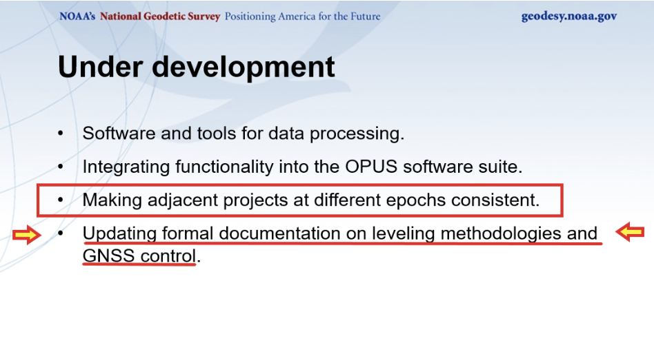 I have worked with leveling data for most of my career and I am pleased to know that NGS is going to provide tools to incorporate leveling data into the new, modernized NSRS. When performing leveling projects, there is a requirement to level to previously established benchmarks that were within a certain distance from the project. This helped to ensure that different leveling projects were consistent with each other. NGS stated that making adjacent projects at different epoch consistent is under development, and their plans include updating leveling documentation to explain the leveling methodologies and GNSS control.