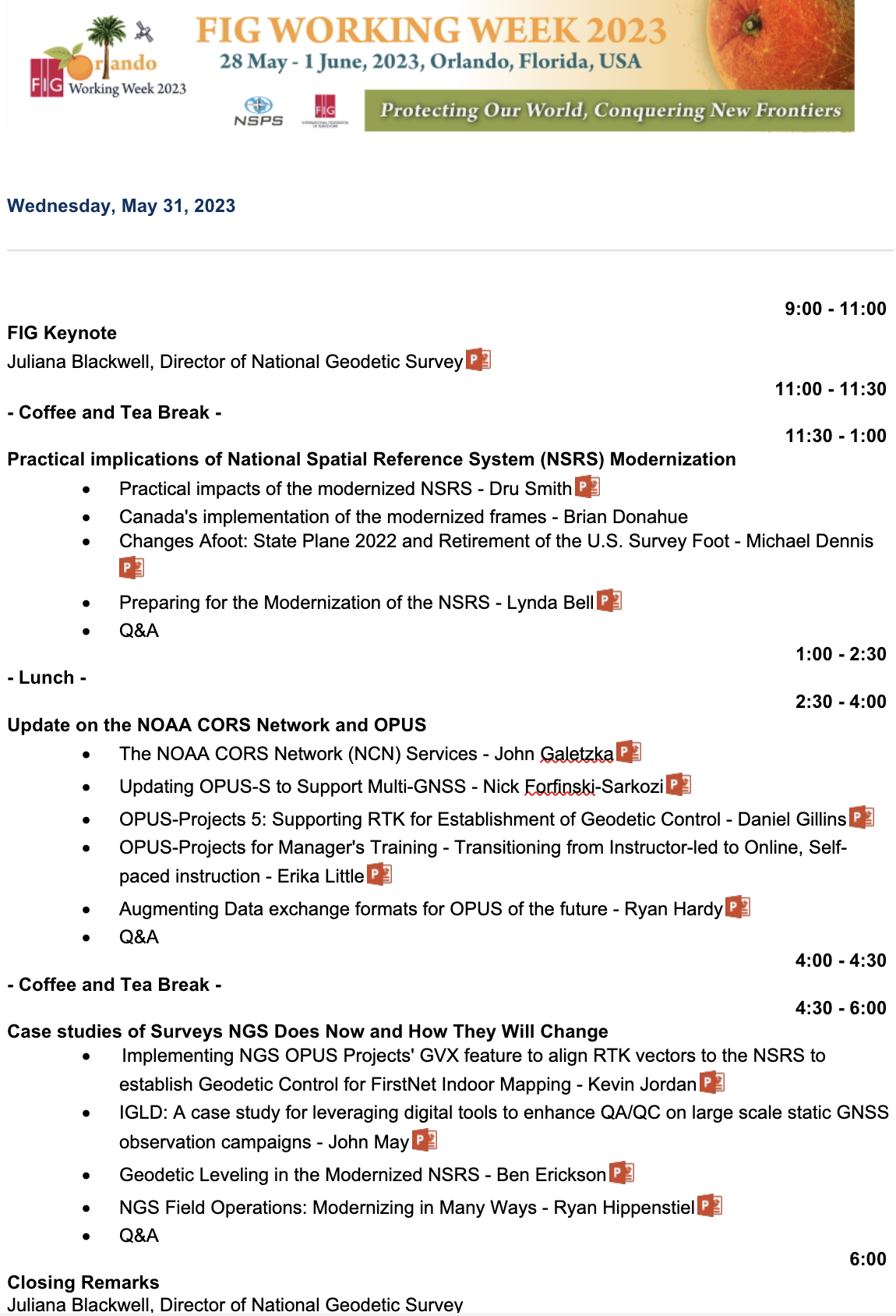 I have only highlighted a few of the presentations. It was an all-day session, and a lot of information was presented on the new, modernized NSRS. The presentations can be downloaded from the NGS website at https://geodesy.noaa.gov/datums/newdatums/fig-2023.shtml. I would encourage everyone to download the presentations to obtain the latest information on NGS’s modernization of the NSRS. See the image below for the list of presentations and the links to download specific presentations.