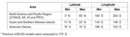 As the image above indicates, the xGEOID20 is available over a very large area. The box below lists the latitude and longitude boundaries of the areas where xGeoid20 is available.
