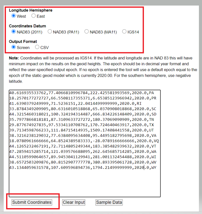 Users have the option of getting the output from the xGeoid20 tool on their computer screen or in the CSV format. The box below is an example of inputting data using the screen option. Once you enter your data, the user clicks on the submit button.