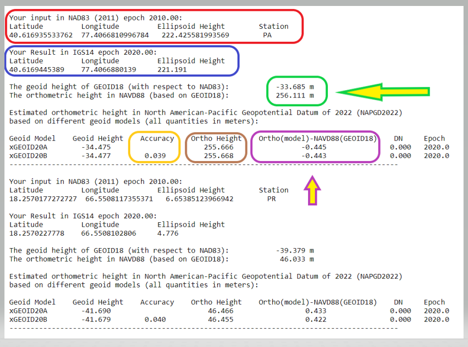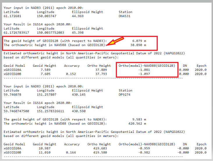 • The geoid height of GEOID18 (with respect to NAD83) and the orthometric height in NAVD88 (based on GEOID18) (green). This NAVD 88 value is for comparison purposes only. It is using GEOID18 and provides an estimate of the differences between the future NAPGD2022 and the current NAVD 88. The orthometric height is computed using the following formula: NAD 83 (2011) ellipsoid height (epoch 2010.0} minus GEOID18.