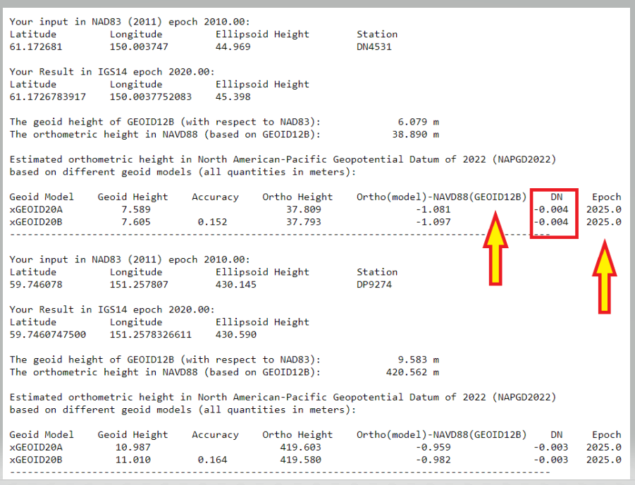 DN: the time-dependent geoid change computed between user inputted epoch (t) and t0. To obtain the dynamic geoid height at user inputted epoch (t), add N + DN. Either Model A or Model B N values may be used for this depending on user preference.
