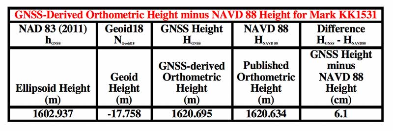 The table below provides the calculation using the data from the box titled “Passive Mark Lookup Tool — A.” The calculation [HGNSS = hGNSS — NGeoid18; Difference = HGNSS — HNAVD 88] has been described in several of my previous columns (this one, for example).