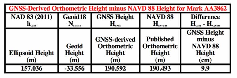 It should be noted, according to the Geoid18 GPS on BMs dataset that users can download, this station, AA3862, was not used in the creation of Geoid18. The table below provides the difference between the GNSS-derived orthometric height and the published NAVD 88 height.