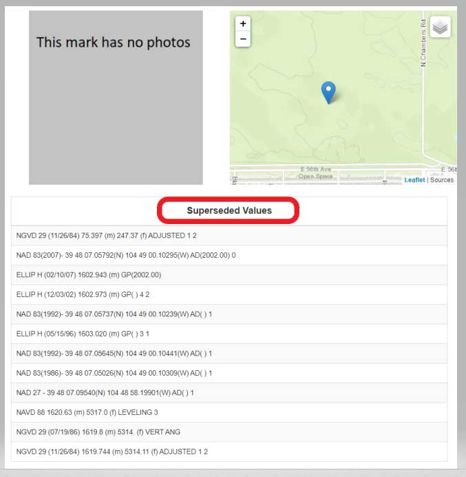 The webtool provides a map depicting the location of the station, photos (if available), and previously published, superceded values of the mark. See the box titled “Passive Mark Lookup Tool — B.”