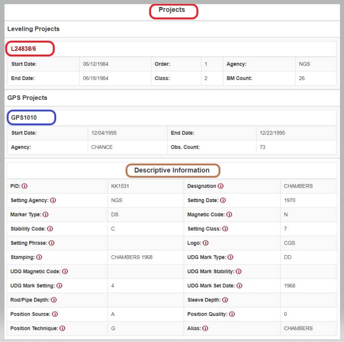 In the example of Chambers, KK1531, no photos were available. It would be helpful if a user would provide photos to NGS when visiting this station. (Note: NGS has a webtool for users to submit recovery information about a mark as well as to provide current photos of the station.) The new Passive Mark webtool also provides information about the survey projects that the mark has been involved in such as leveling and GNSS projects.