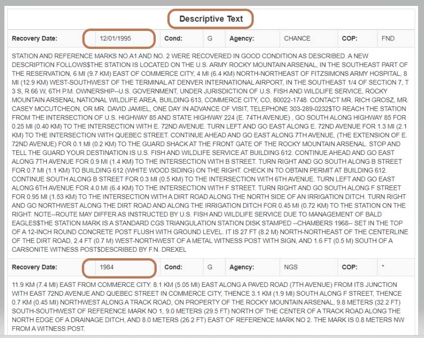 NGS has developed a new beta tool for obtaining geodetic information about a passive mark in their database. This column will highlight some features (available as of Oct. 5, 2020) that may be of interest to GNSS users. It provides all of the information about a station in a more user-friendly format. The box titled “Passive Mark Lookup Tool” is an example of the webtool. The tool provides a lot of information so I have separated the output of the tool into several boxes titled “Passive Mark Lookup Tool — A through D.”
