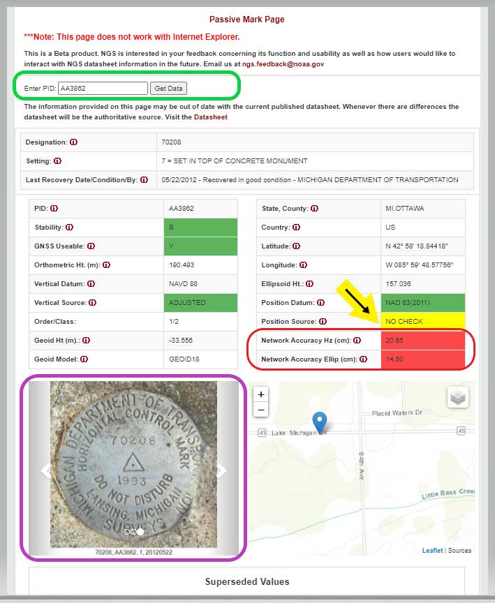 I want to highlight a few other attributes of this webtool. The station, PID AA3862, has an interesting attribute that users should take note of; that is, the NAD 83 (2011) position source is NO CHECK. See box titled “Passive Mark Page for PID AA3862.”