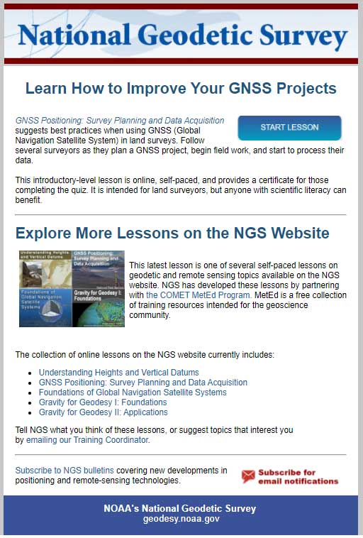 One last item that may be of interest to GNSS users is that NGS, working with the University Corporation for Atmospheric Research (UCAR), developed another online GNSS lesson (see box titled “New GNSS Lesson by NGS and UCAR”). These lessons are free but users must sign up to access the website and lesson.