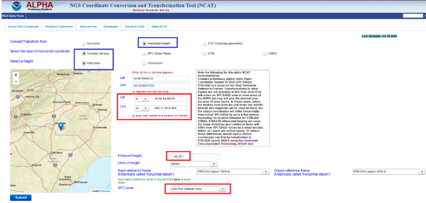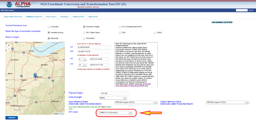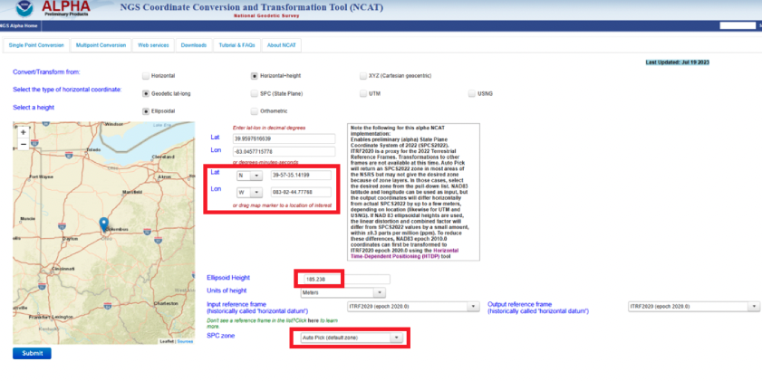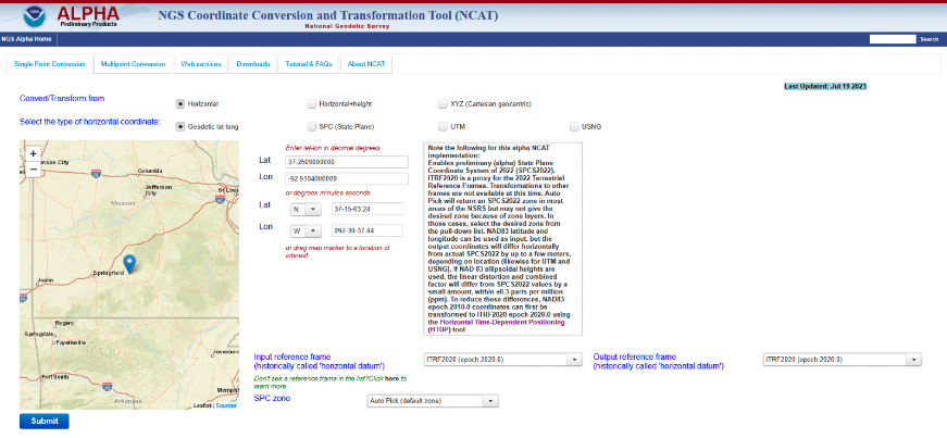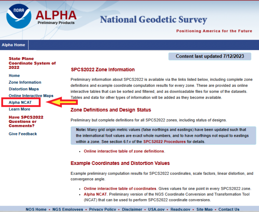 Another Alpha site available for users to evaluate is the NGS Coordinate Conversion and Transformation Tool (NCAT). NCAT is probably the tool that most surveyors will be interested in using and providing feedback to NGS. Users can access NCAT on the Alpha SPCS2022 webpage or by clicking here.