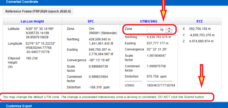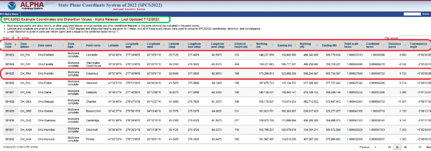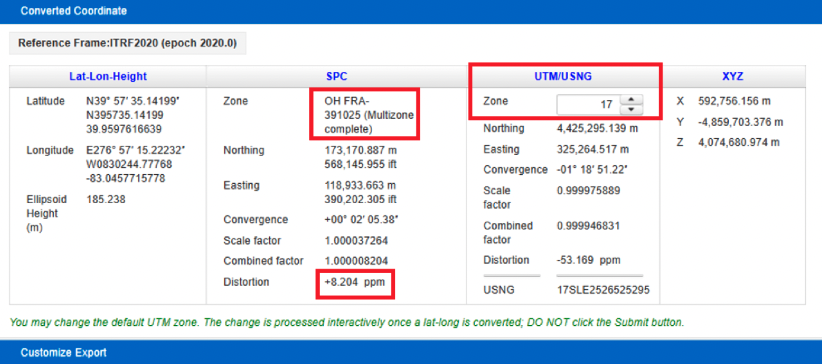 Users can obtain specific information for a coordinate located in the Ohio Franklin Zone by clicking on the online interactive table of coordinates. Note that the distortion is 6.725 ppm at the coordinate in the zone. As previously stated, this was a user–defined LDP zone.