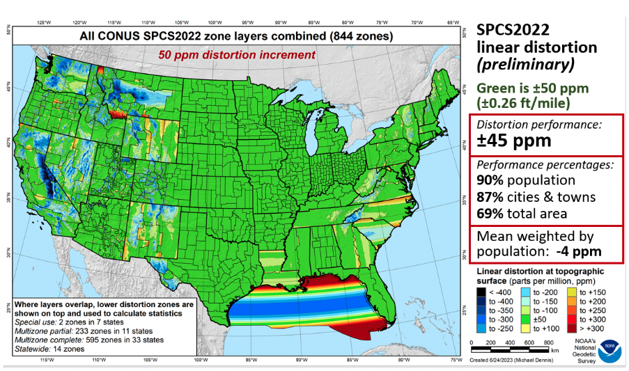 Dennis provided a slide depicting SPCS2022 linear distortion for all CONUS zones with a 50 ppm distortion increment as seen below. As indicated on the slide, green is +/- 50 ppm. The distortion performance is +/- 45 ppm.