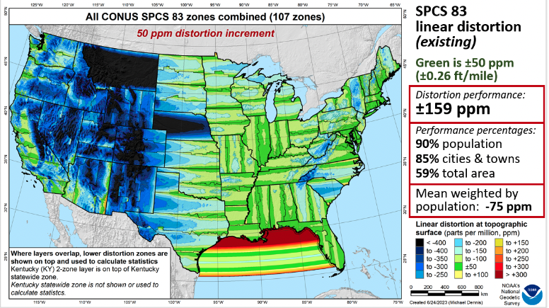 As a comparison to the existing SPCS83 zones, he provided a similar slide for the CONUS SPCS83 zones. See below. As in the previous slide, green represents +/- 50 ppm. The distortion performance is +/- 159 ppm.