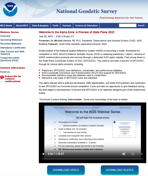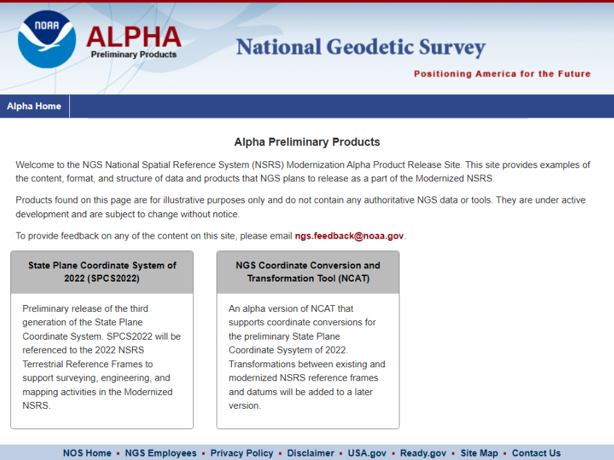 That said, NGS would like everyone to try the Alpha products and provide feedback to NGS. The first two Alpha products are State Plane Coordinate System of 2022 (SPCS2022) and NGS Coordinate Conversion and Transformation Tool (NCAT). On July 20, NGS held a webinar previewing the Alpha site. Readers can download the powerpoint and video of the presentation here.